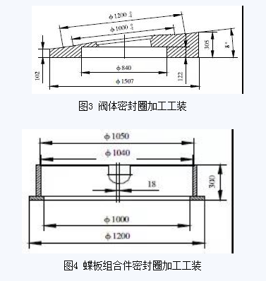 从三偏心金属硬密封蝶阀的结构特点分析,蝶板组合件密封圈为不锈钢板与石棉板的组合件,阀体密封圈为硬质合金,硬度很高,进刀量很难控制,不易一次加工成型,而且加工面的粗糙度要求很高。为保证加工要求,工艺过程为阀体或蝶板组合件粗加工—阀体密封圈堆焊硬质合金—保温12h—热处理消除热应力—上工装粗车密封面—上工装精车密封面—上磨头磨削密封面—阀体与蝶板组合件合镗轴孔—强度试验—密封试验。