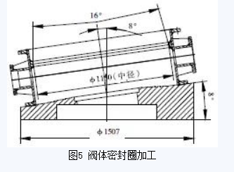 阀体起密封作为的为密封圈,焊接在阀体内(图5)。在2.5m立车上将组焊好的阀体装夹在阀体密封圈加工工装上,将立车刀杆旋转8°,根据图纸设计要求,找正后沿圆锥母线方向走刀,车至未焊不锈钢前的尺寸。然后堆焊不锈钢,最后将焊好不锈钢的阀体重新上立车,按上述方法车阀体密封圈至图纸要求尺寸。最后在立车刀架上装磨头,对阀体密封圈进行磨削处理,使其达到图纸设计粗糙度要求。