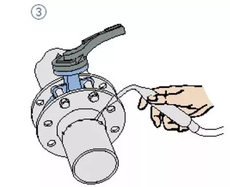 6、待焊口冷却后再安装阀门。保证阀门在法兰中有足够活动空间以防止阀门被损坏,并保证阀板有一定的开度;
